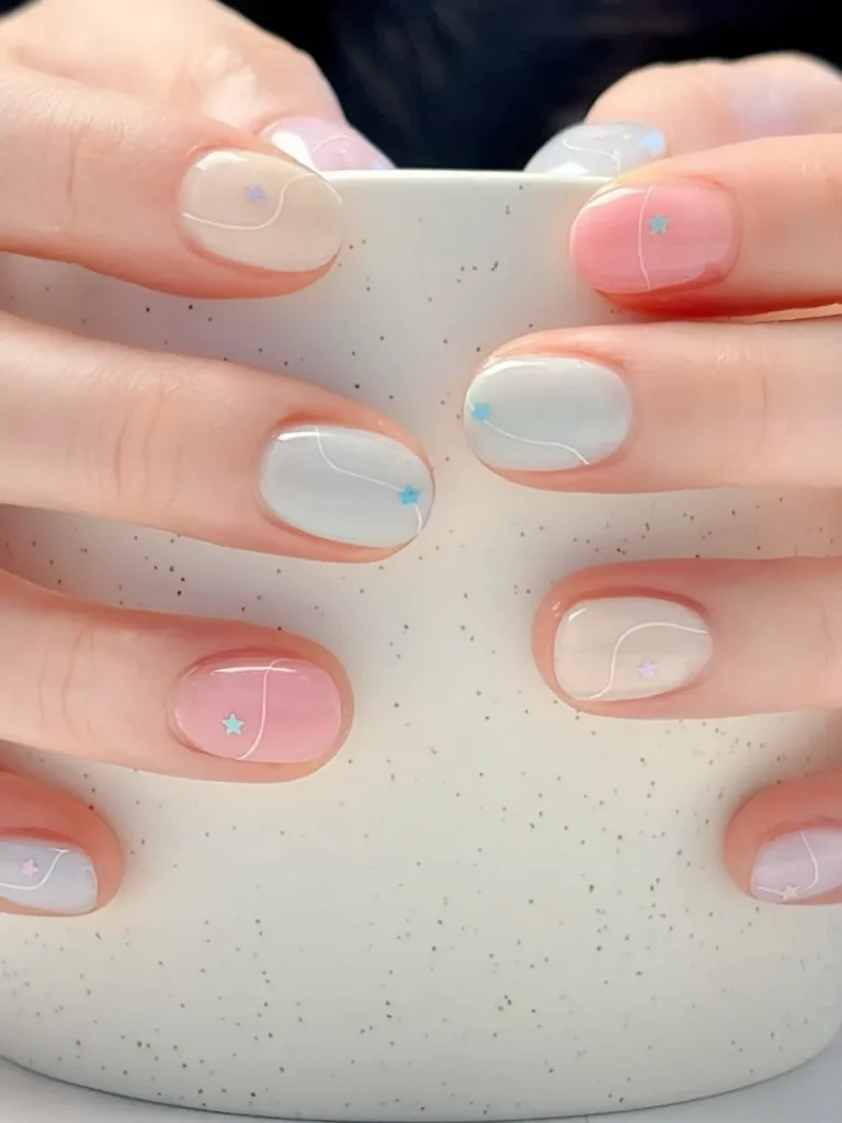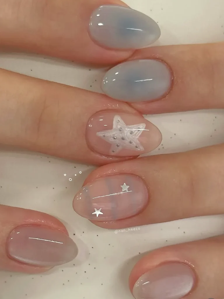 A mix of muted blue jelly and milky white nails. The silver chrome stars give it a dreamy, night-sky vibe that works perfectly with denim.