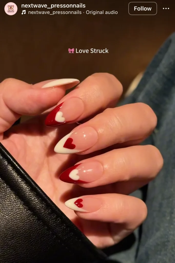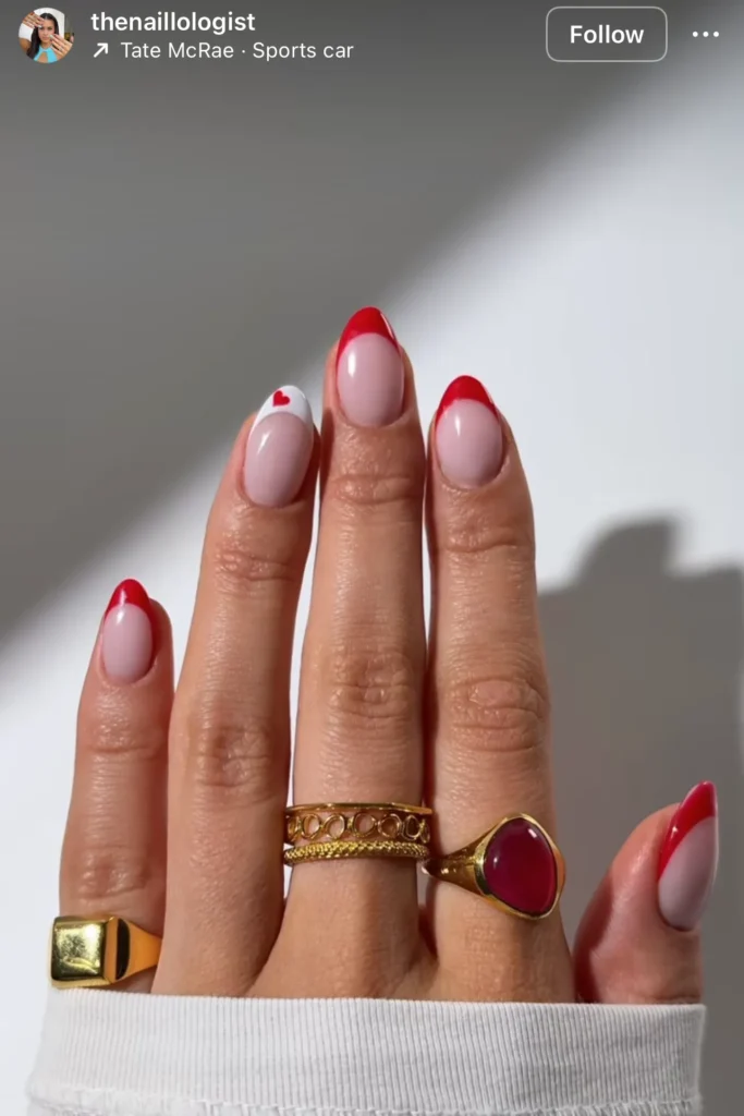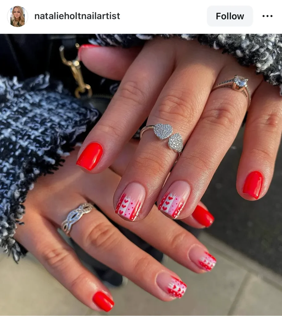 At first glance, it’s just a clean red French—then the hearts appear, almost like an afterthought someone added with a smile.