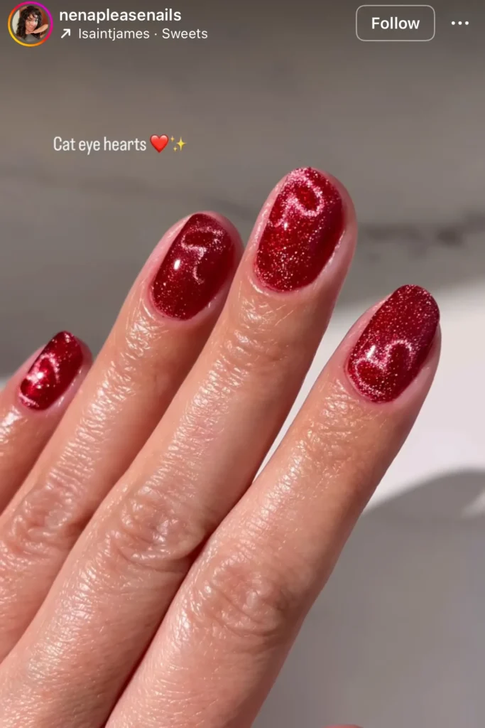 Cat-eye polish already catches light in such a pretty way, and the little red hearts layered on top make it even more charming.