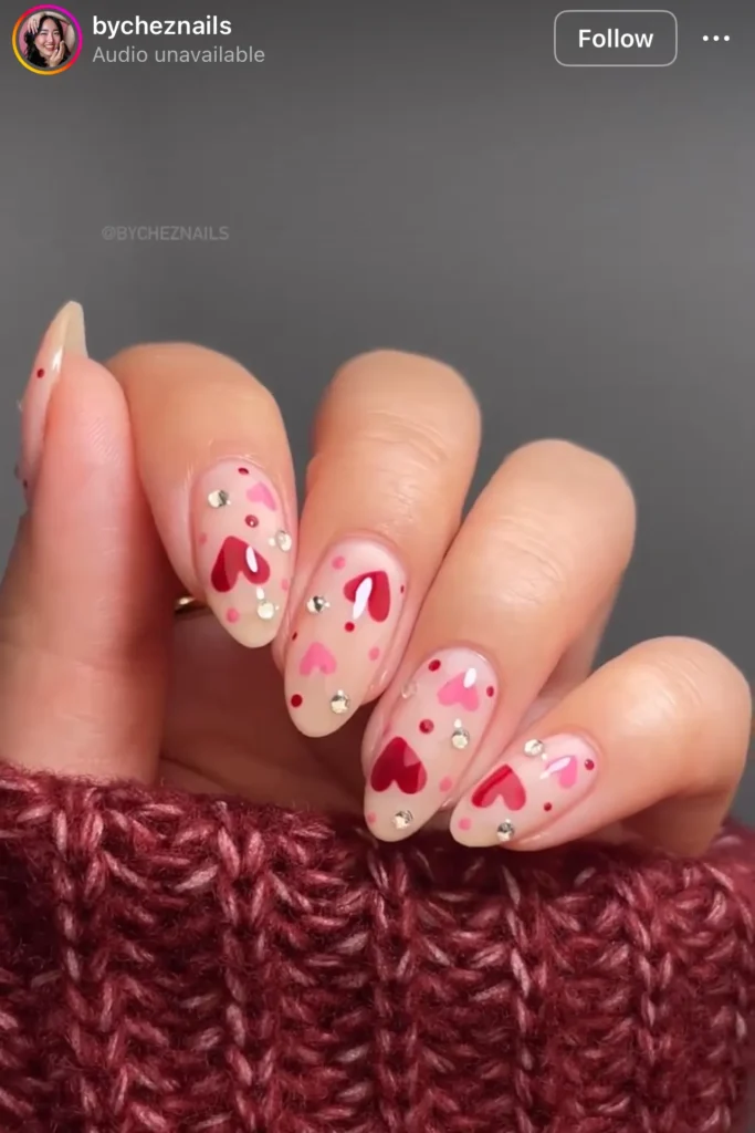 The almond shape feels gentle, the pink hearts add a kind of warmth, and the whole design settles into this easy, romantic mood that you might connect with instantly.