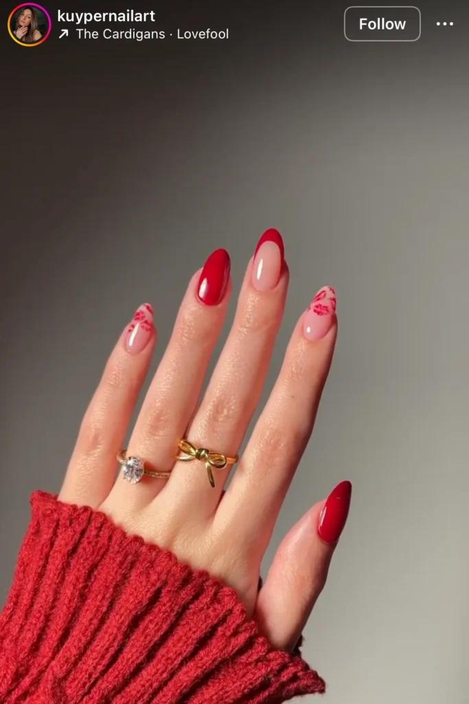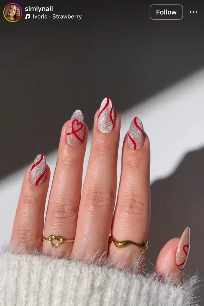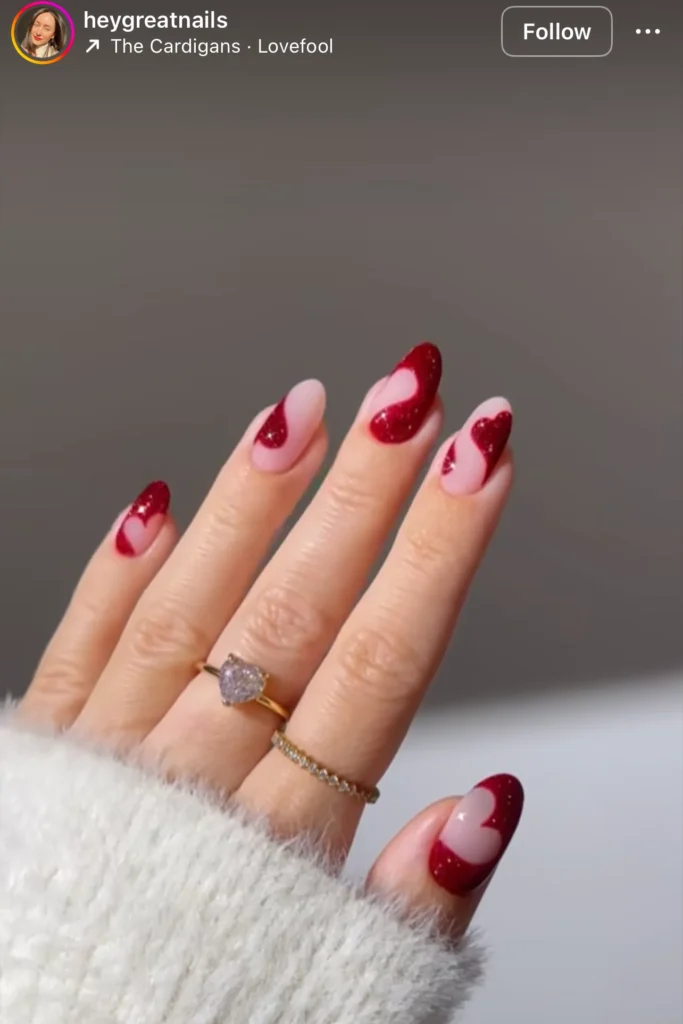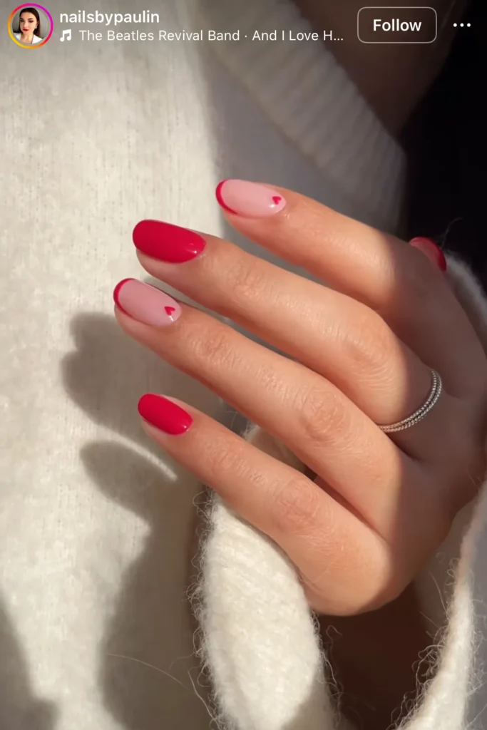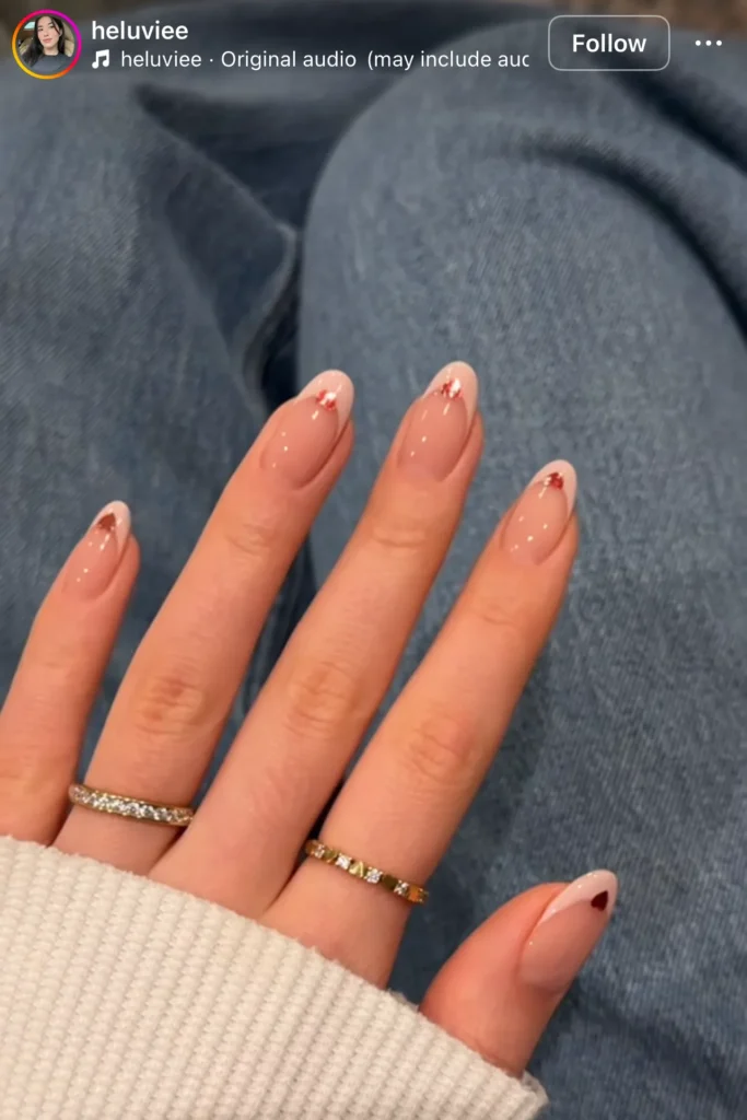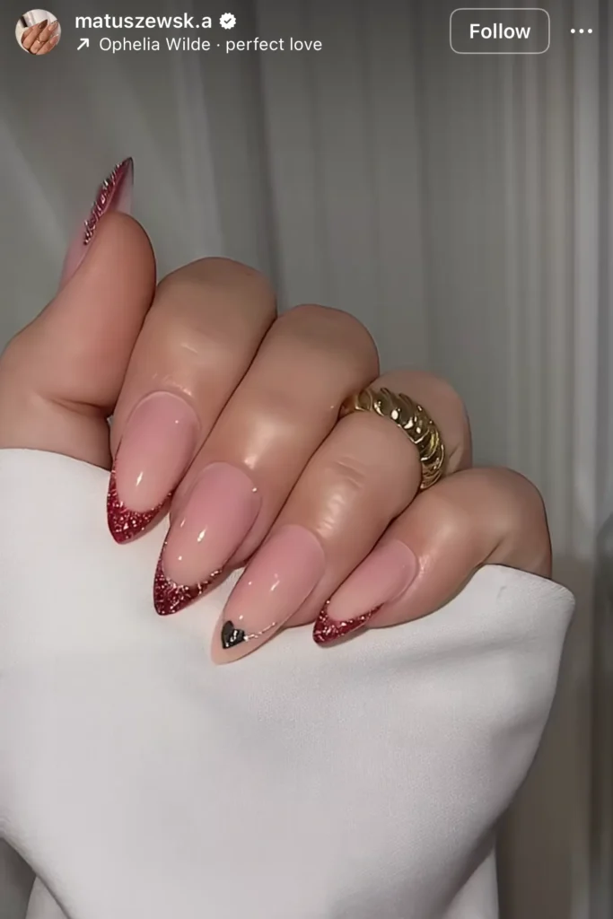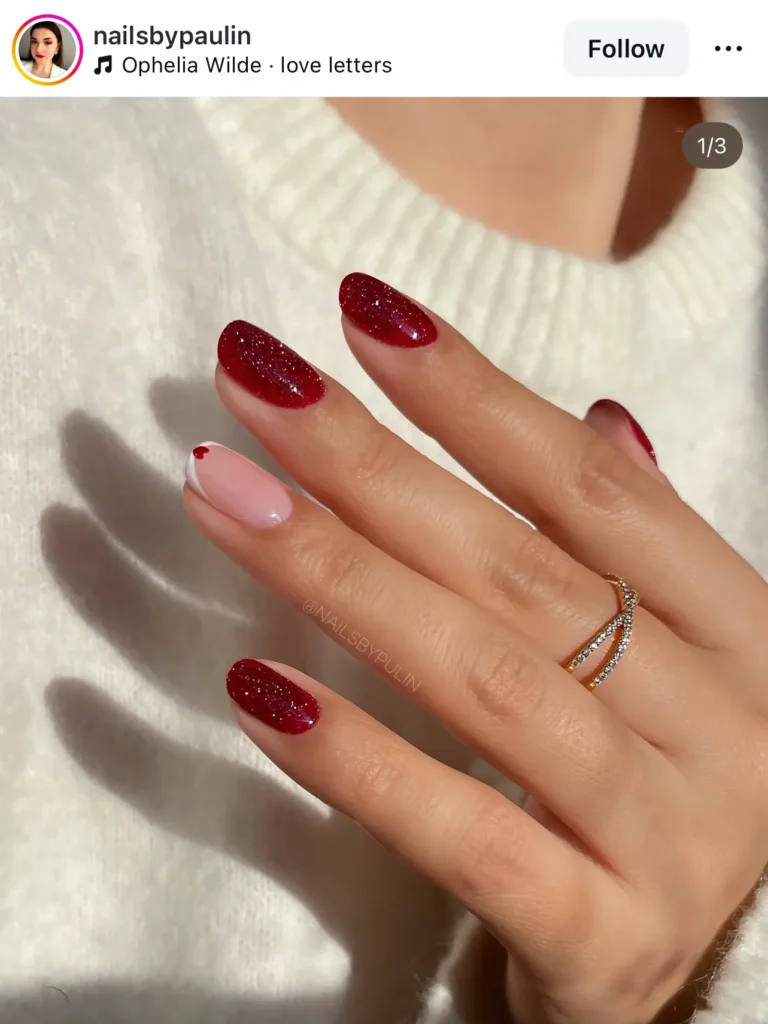 The glittery red nails feel festive on their own, but the one French finger breaks it up in such a fun way. Adding a tiny heart along the line makes it feel personal instead of just sparkly.