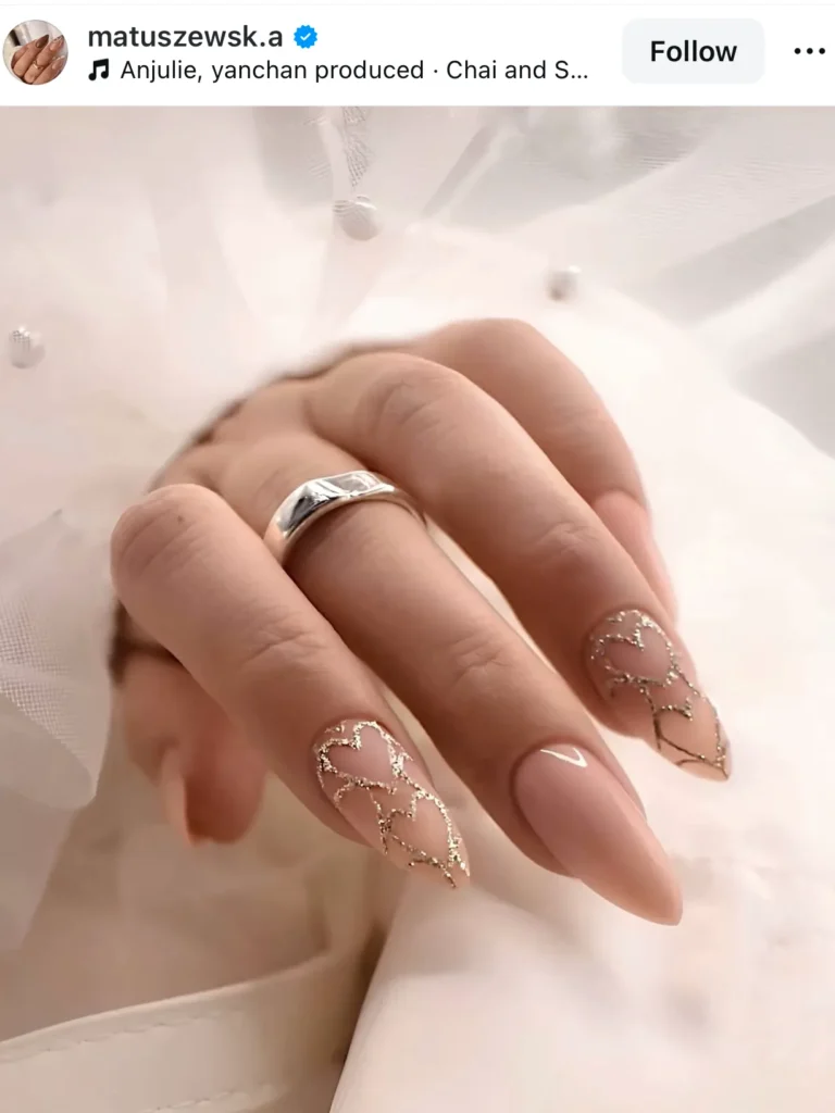 This one feels a little dressier without being too much. The nude almond shape stays very calm, and the mix of a gold glitter nail with that tiny heart line on another finger gives it this quiet, put-together mood.