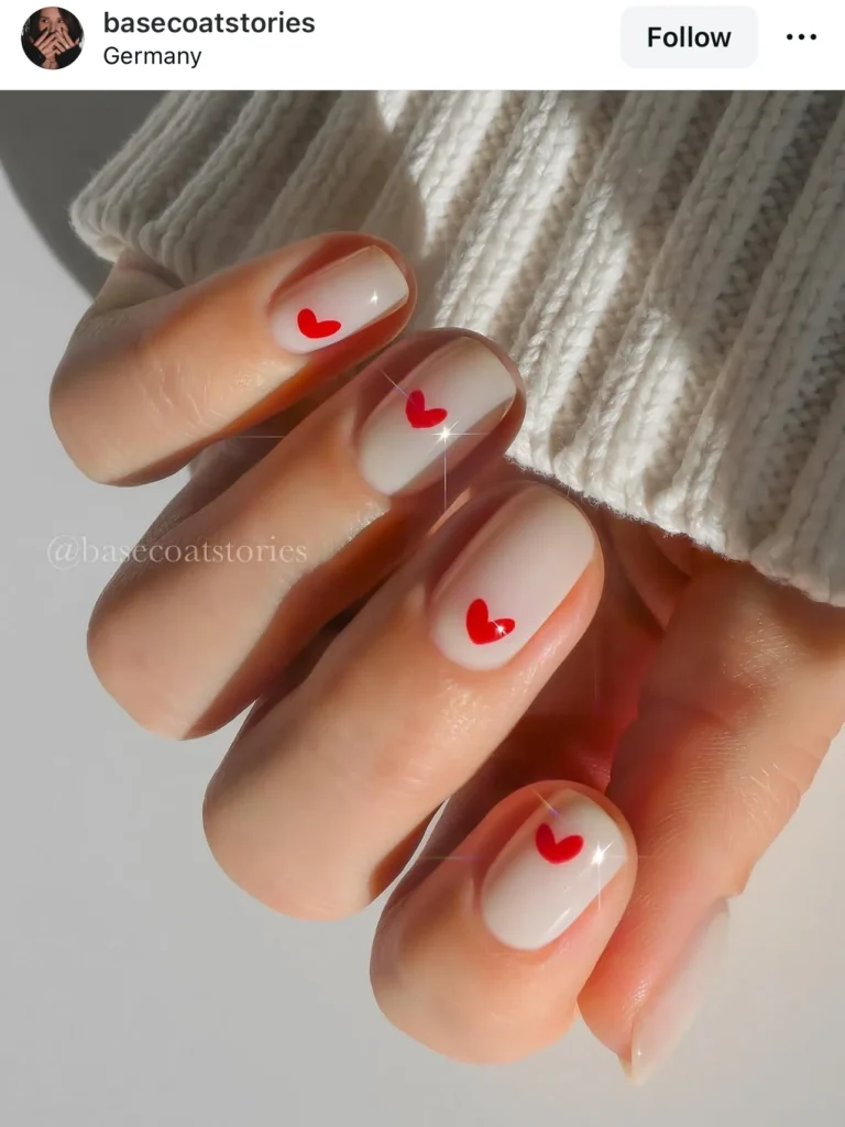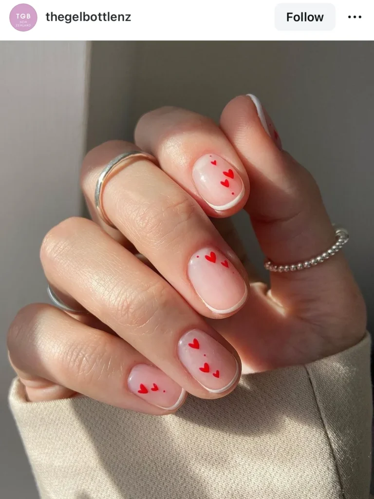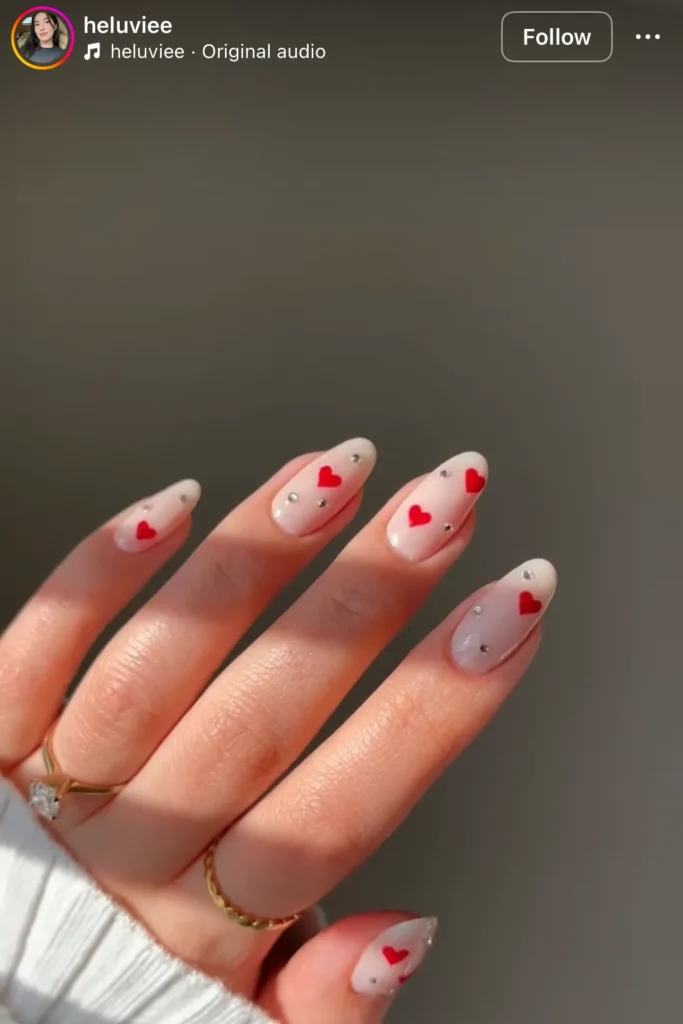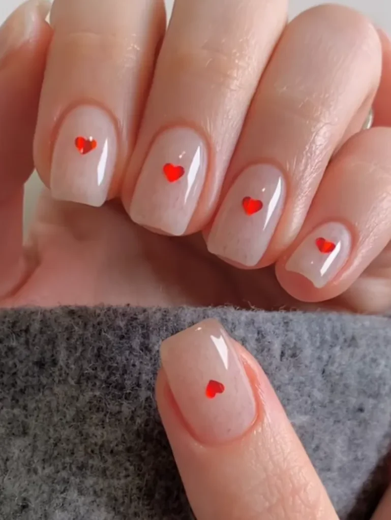 Sheer nude nails always feel light, and the small pink hearts scattered across them add a gentle touch. It’s soft enough for everyday but still brings in a little Valentine mood.