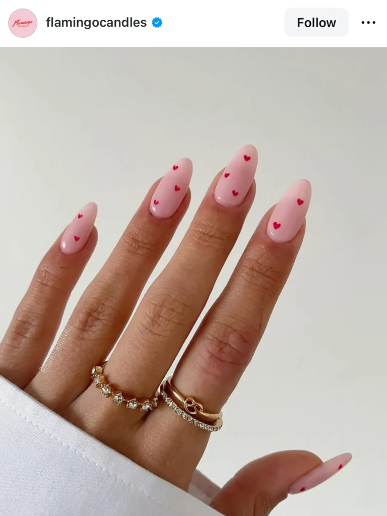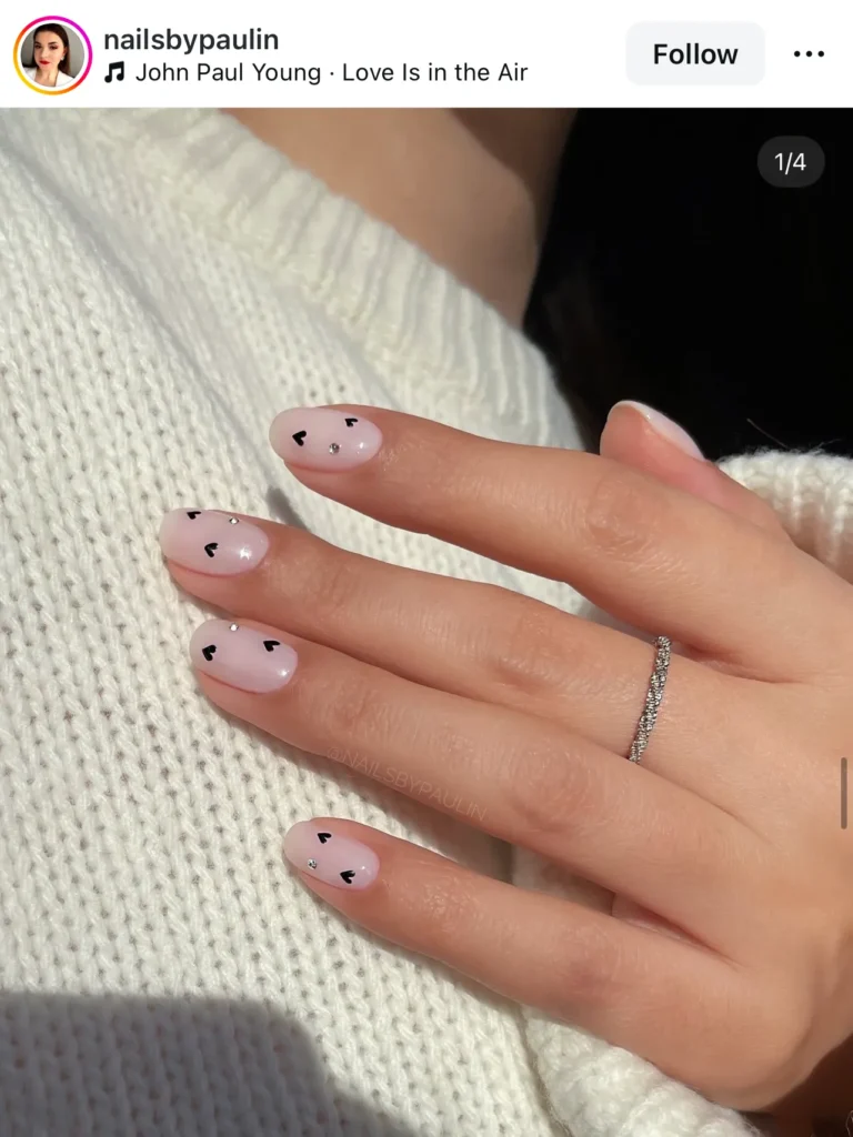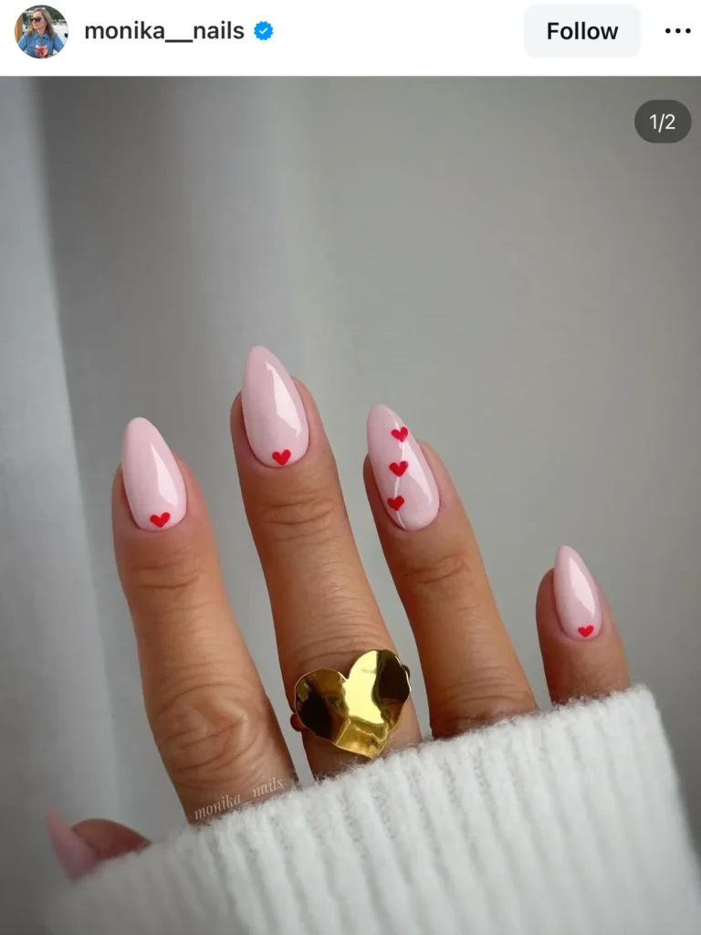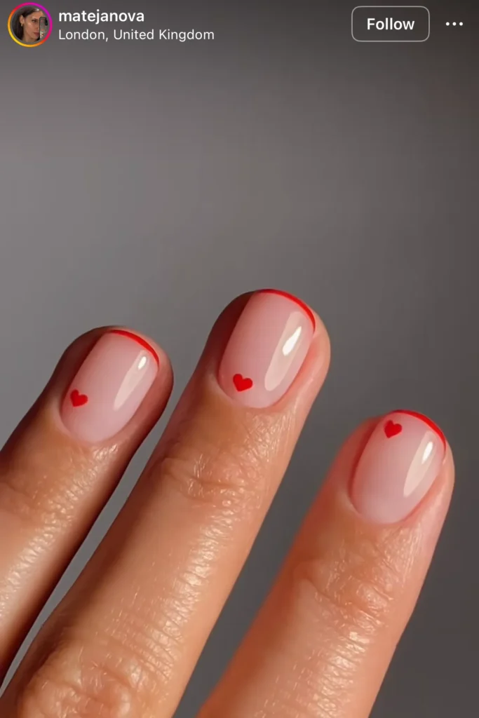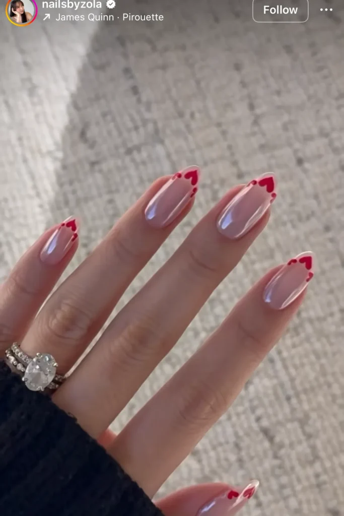 Sheer nude nails always feel light, and the small pink hearts scattered across them add a gentle touch. It’s soft enough for everyday but still brings in a little Valentine mood.