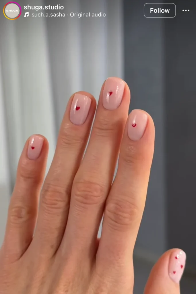 Short nails look so sweet with a milky base. These small hearts are subtle, which is probably why I save this design so often.