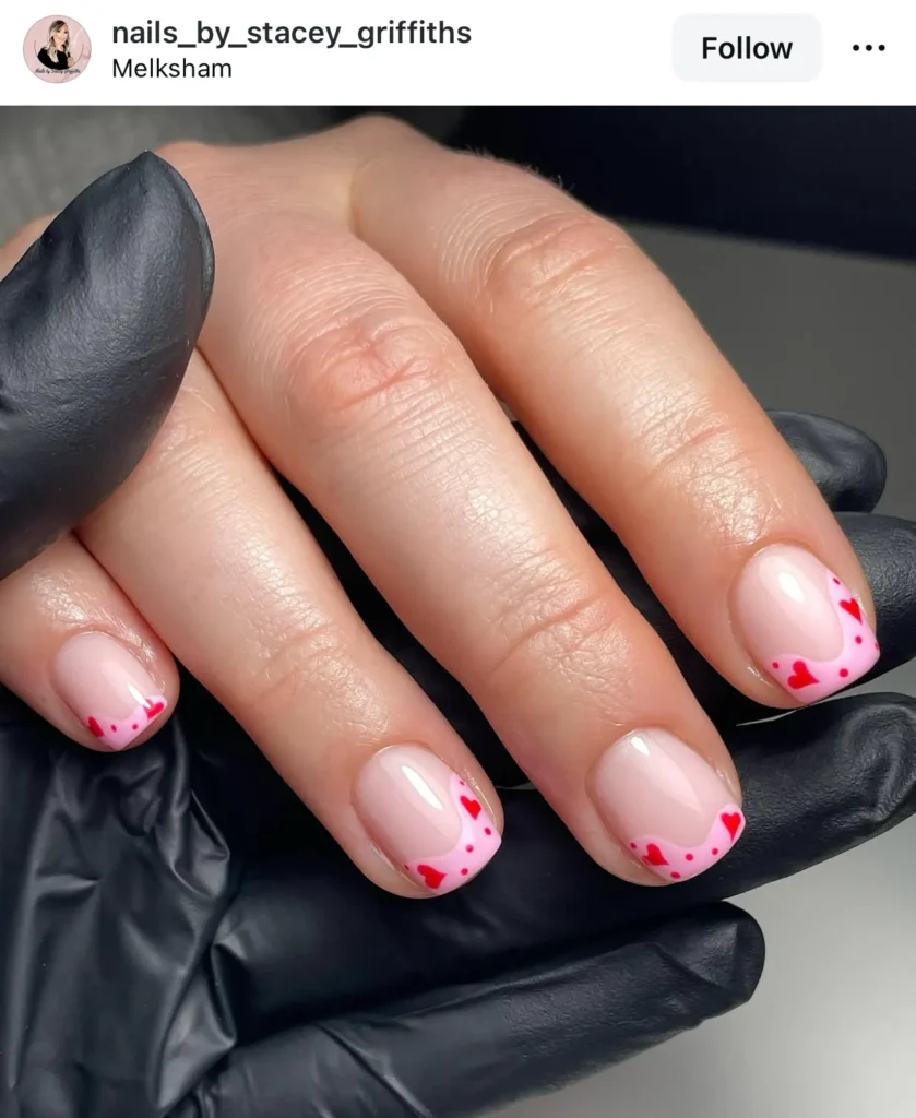 This one feels really gentle. The nude pink keeps everything calm, and the tiny hearts on the French line look like little add-ons you didn’t plan but ended up loving anyway.