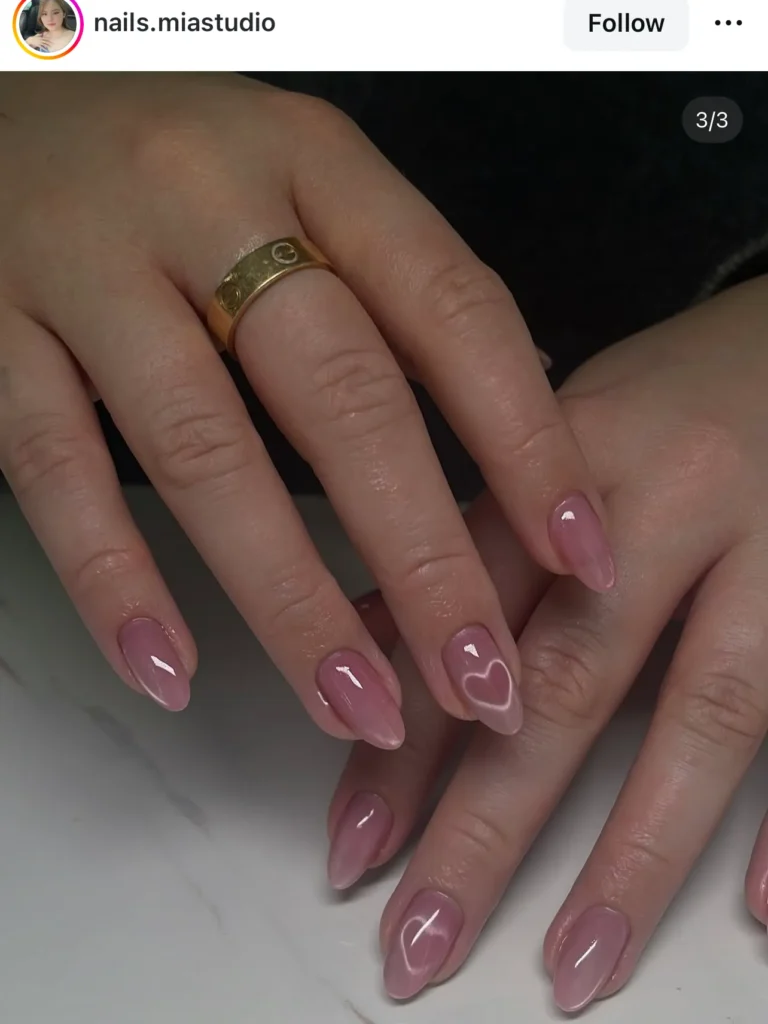 Here the shine does most of the work. The nude base is almost bare, and that single little sequin-style heart in the center of each nail feels like a soft wink rather than full-on Valentine energy.