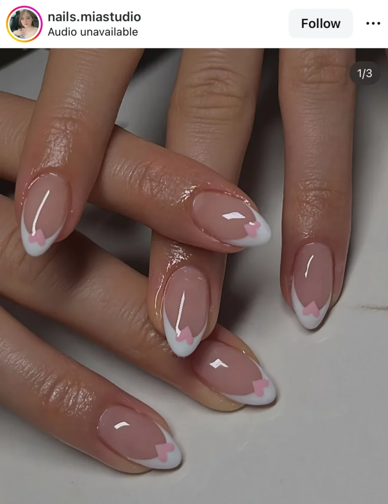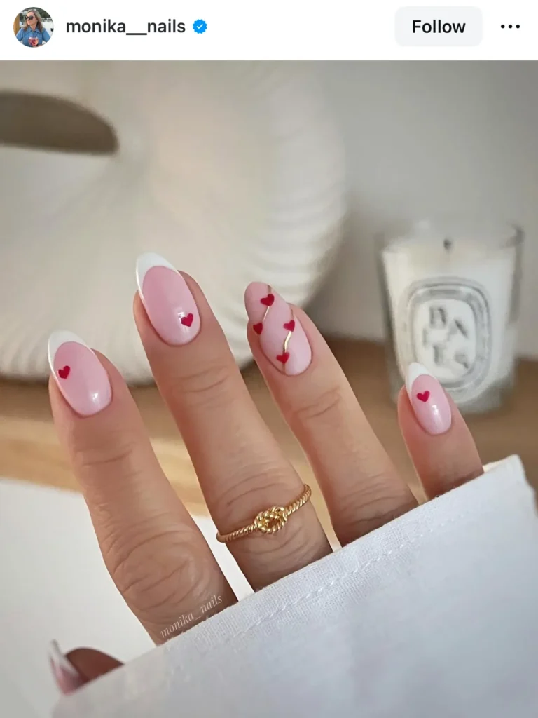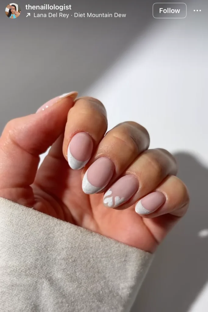 A classic white French already looks fresh, and the tiny pink hearts soften it in such a sweet way. It’s simple, but the color combination keeps it fun.