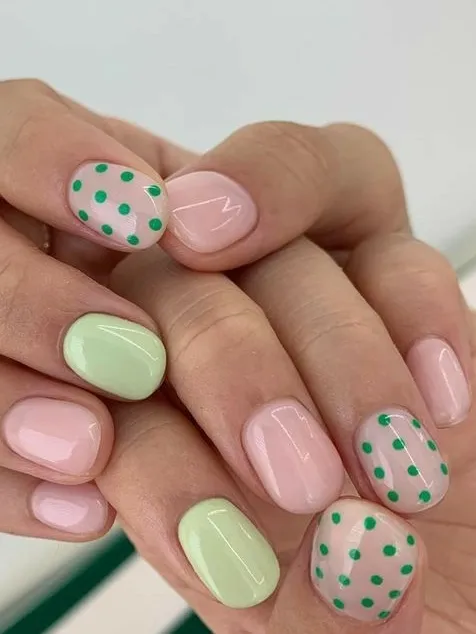 Mixing two different pastel shades on one nail might sound like a lot, but adding a single dot in the center ties everything together perfectly. It’s a very modern, graphic take on spring colors.