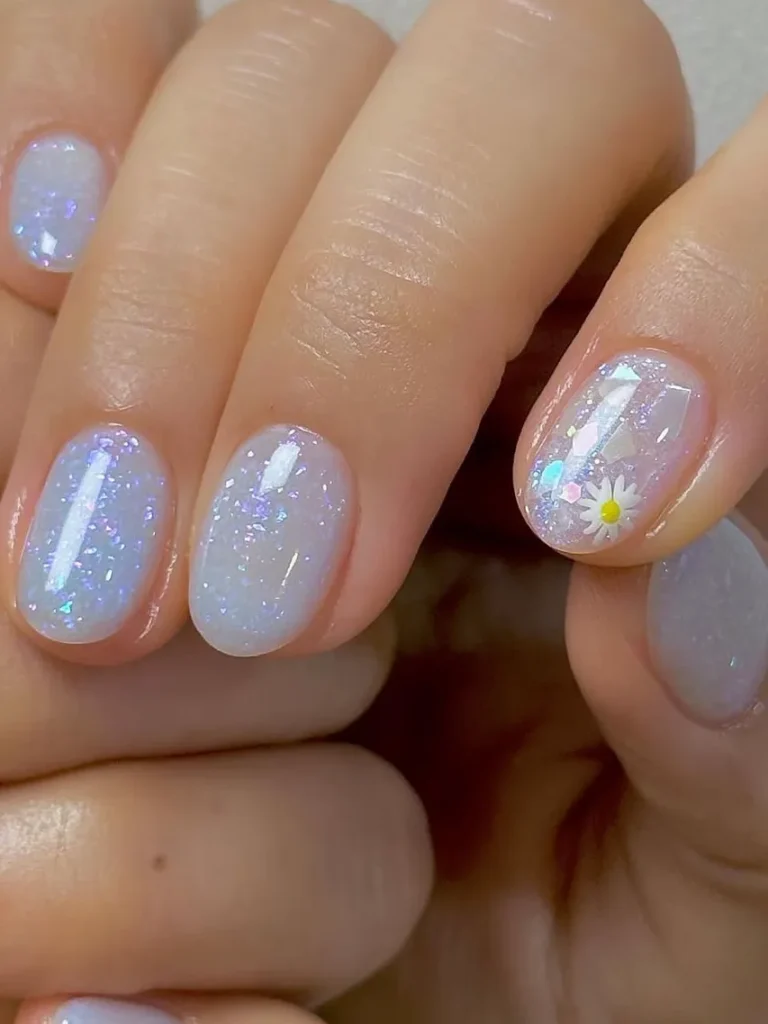 Try a holographic white base if you’re craving a bit of a “wow” factor. That subtle rainbow shimmer creates such a cool, modern contrast against a simple white daisy.
