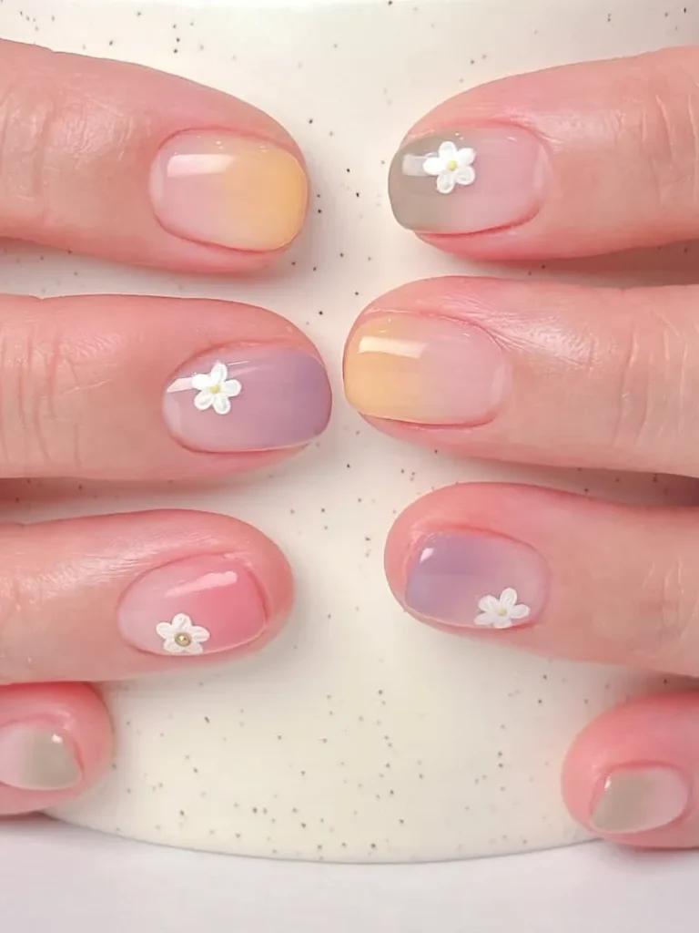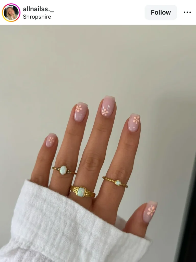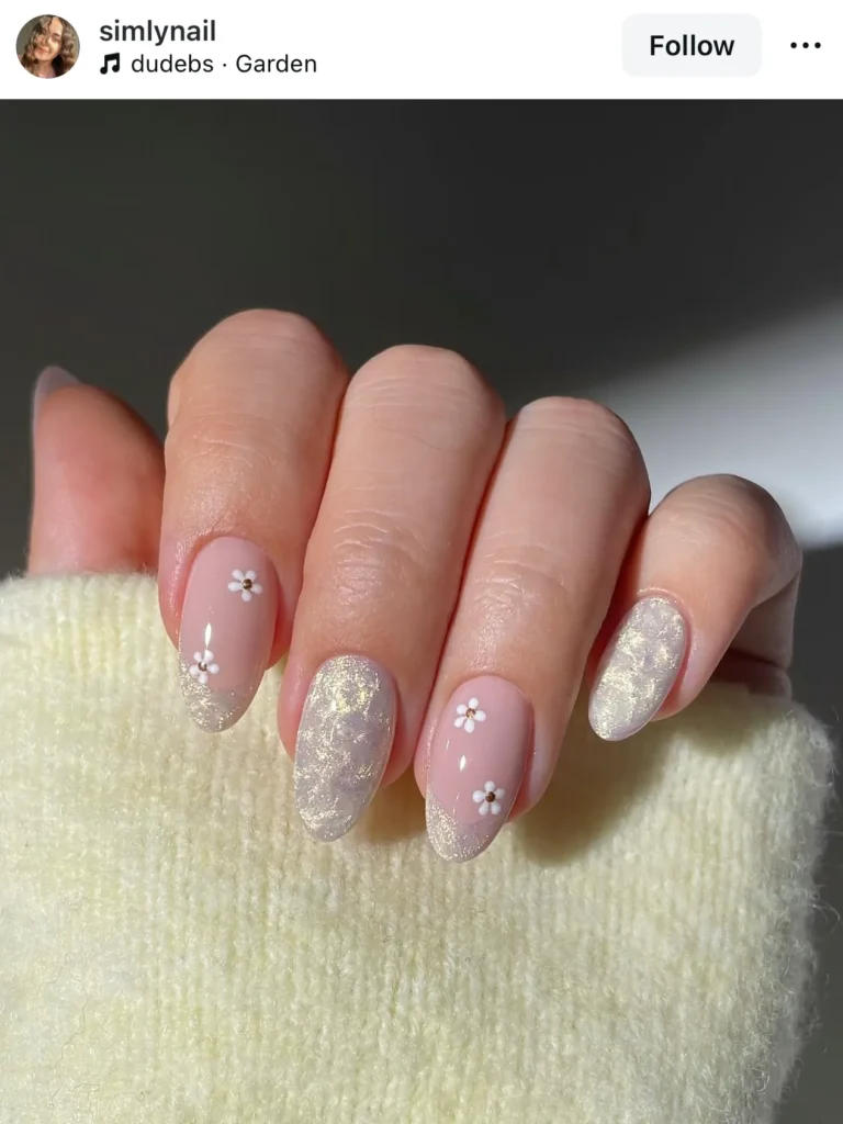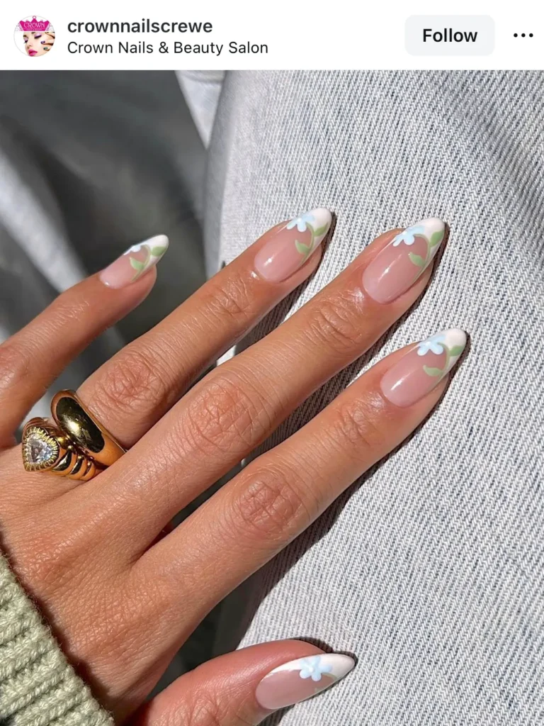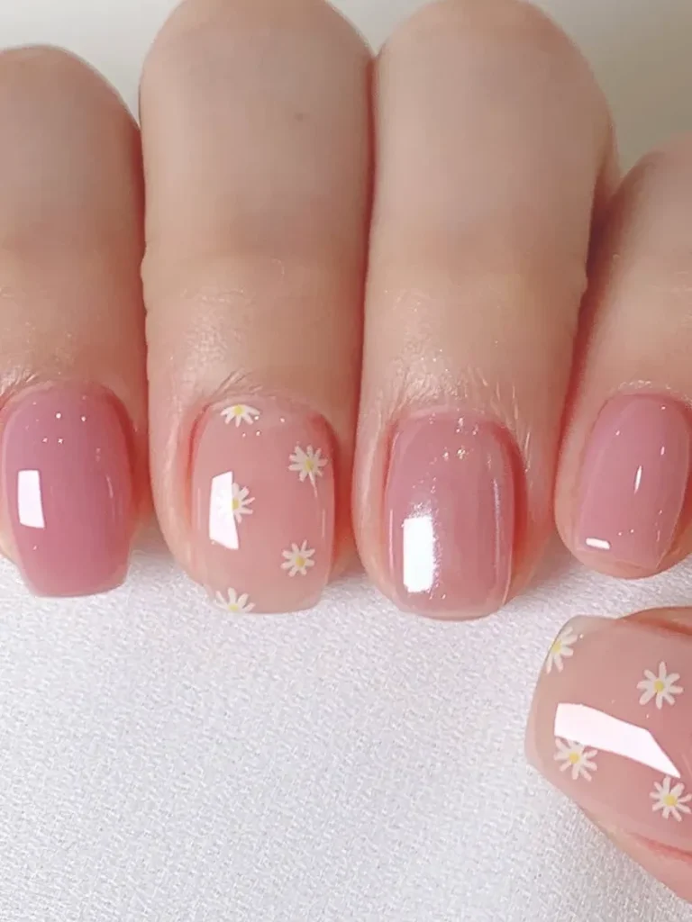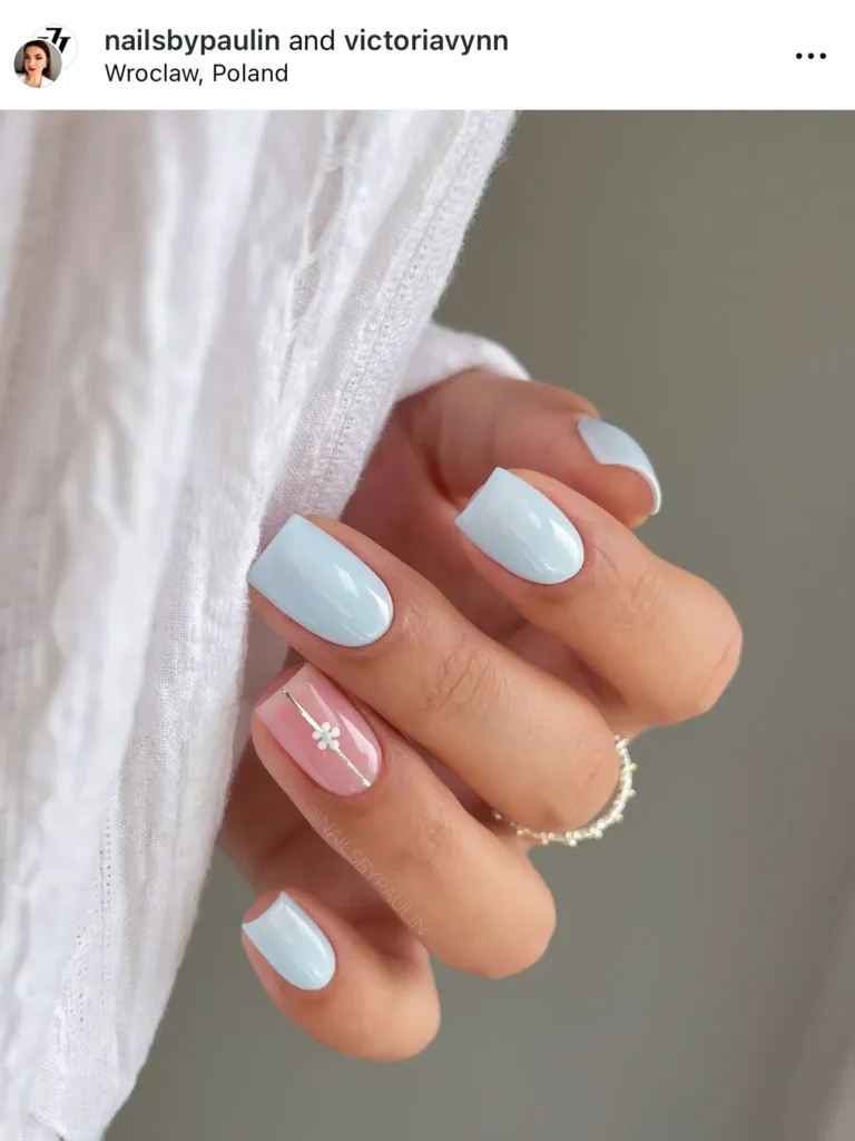 Micro-French is everywhere right now. The light blue keeps it fresh and airy, while the daisies add that perfect touch of spring personality without taking up too much space.
