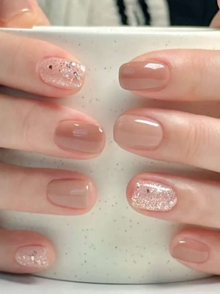 I usually hate chunky glitter, but this micro-shimmer is different. It’s “grown-up” sparkle. The earthy base keeps it grounded, so it just looks like your nails are catching the light in a really cool way.