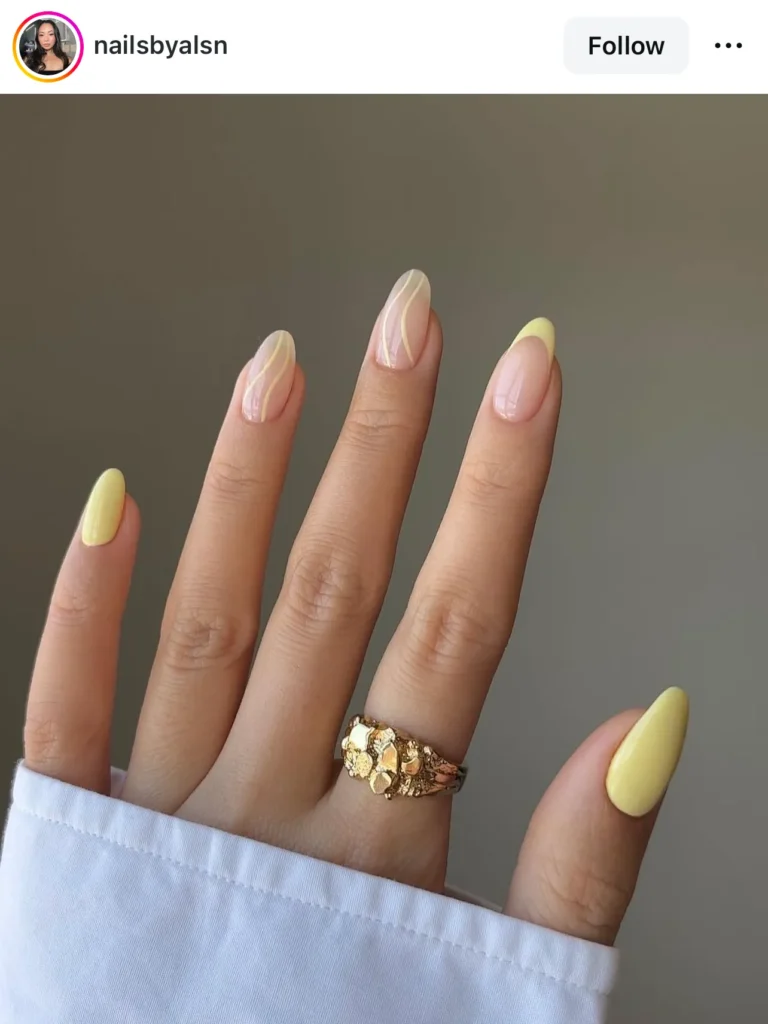 Swirls always feel fresh and modern. By keeping the design minimal and the base airy, it doesn’t feel cluttered. A soft yellow shade with this kind of warmth makes the whole look incredibly wearable for any skin tone.