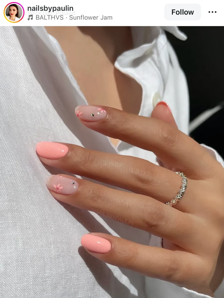 Sometimes, a single accent is all you need to make a statement. Leaving the rest of the nails a solid, sheer nude lets that one floral detail really shine.