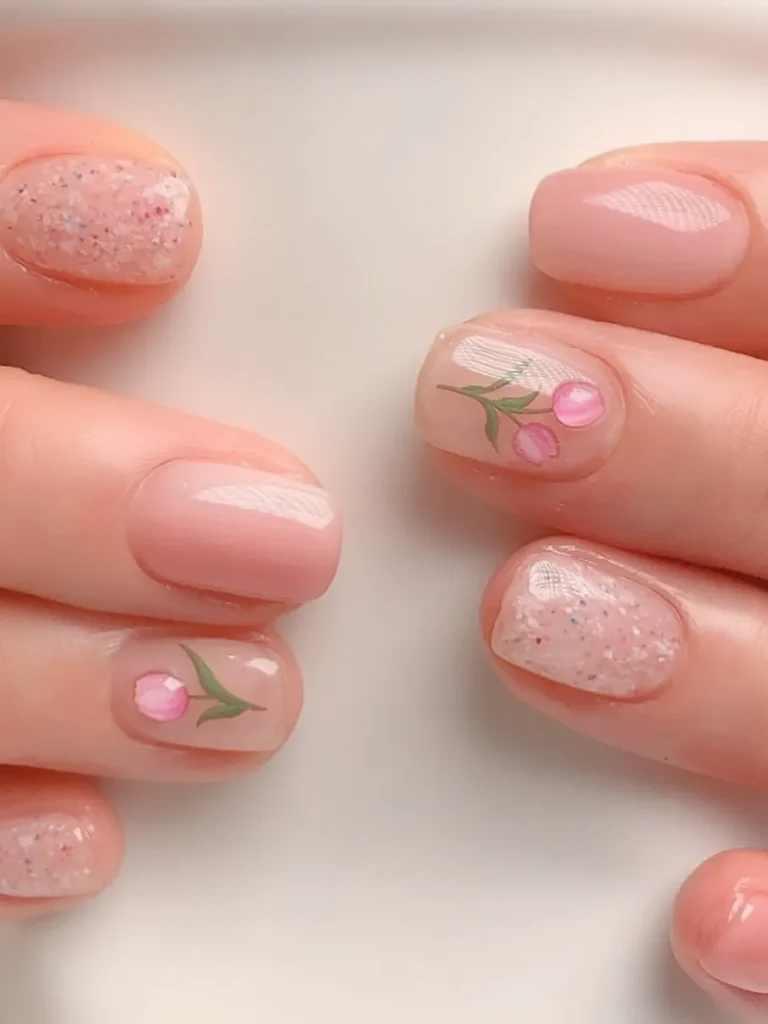Peach nude always makes my hands look “fresh” instead of just beige. Adding a tiny tulip gives it a romantic wink without feeling over-the-top. Perfect for those days when you want something pretty but low-key.
