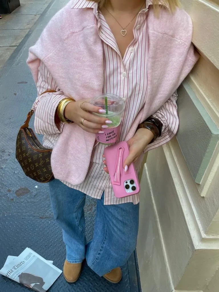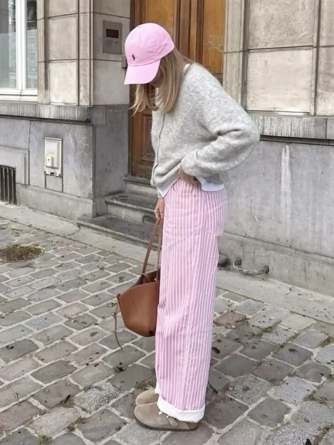 This is my total “cheat code” for looking styled with zero effort. Instead of a single pop, I stick to one soft color and repeat it—like matching a pink cap with pink trousers—then balance it out with easy neutrals like a grey cardigan or neutral shoes.