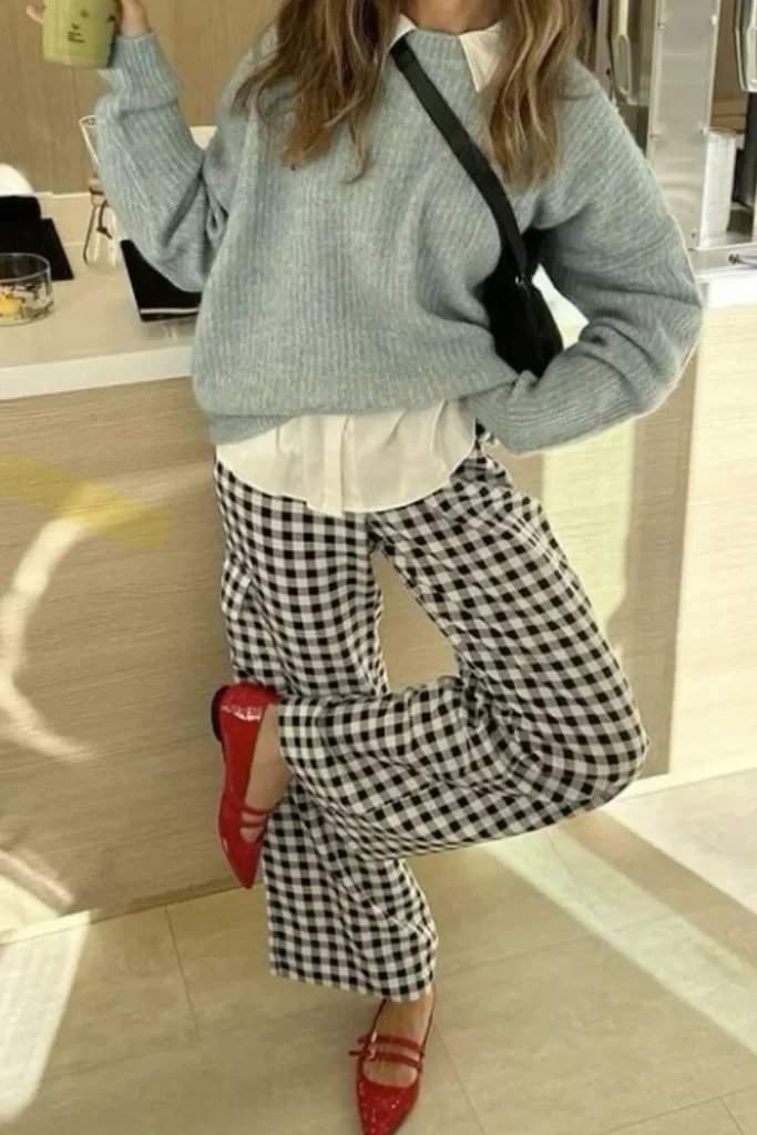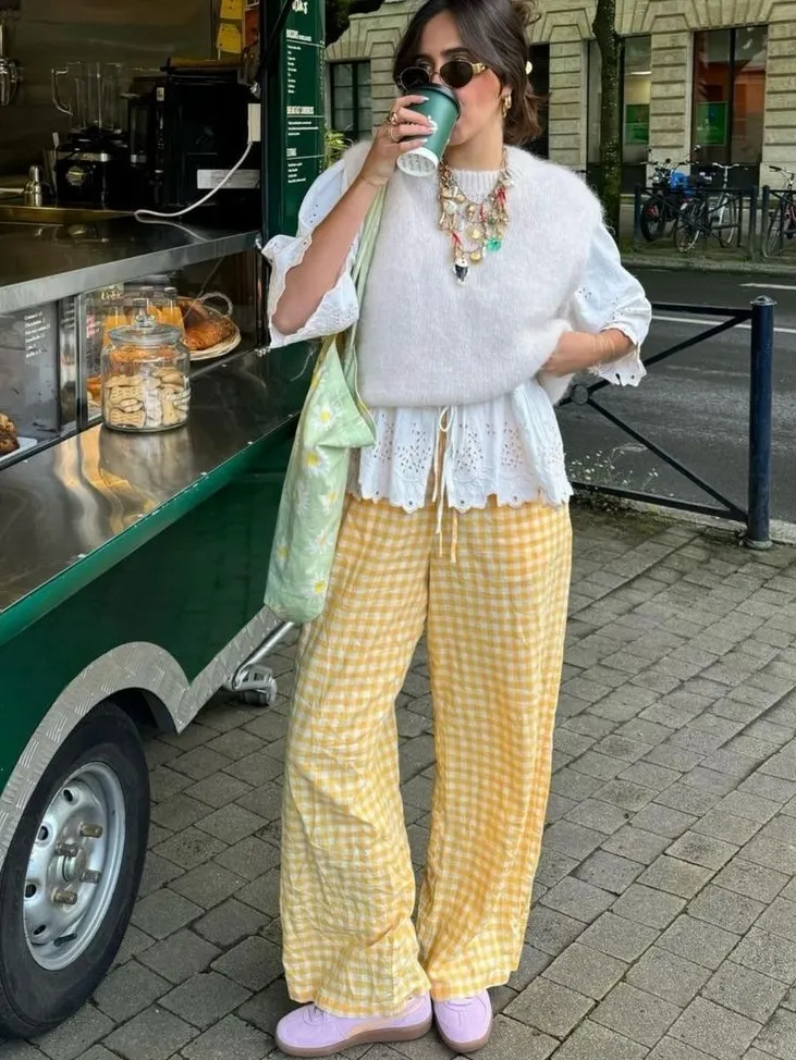 15. Knit Vest + Eyelet Top + Plaid Pants + Sneakers