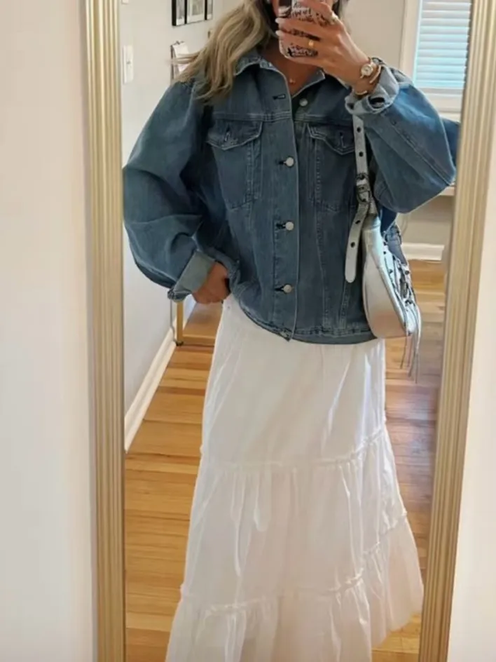 You can’t really do spring without a denim jacket. Pairing it with a clean maxi skirt makes the whole look feel fresh and elevated, not just like another denim outfit.