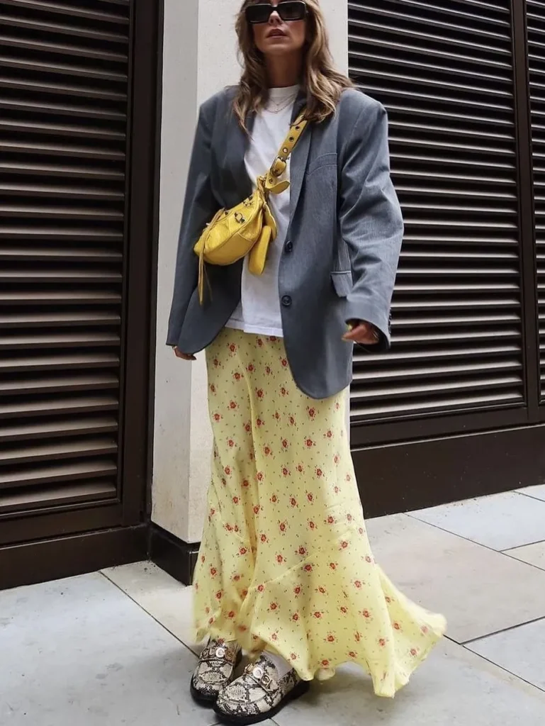 5. Oversized Blazer + Flowy Skirt + Loafers