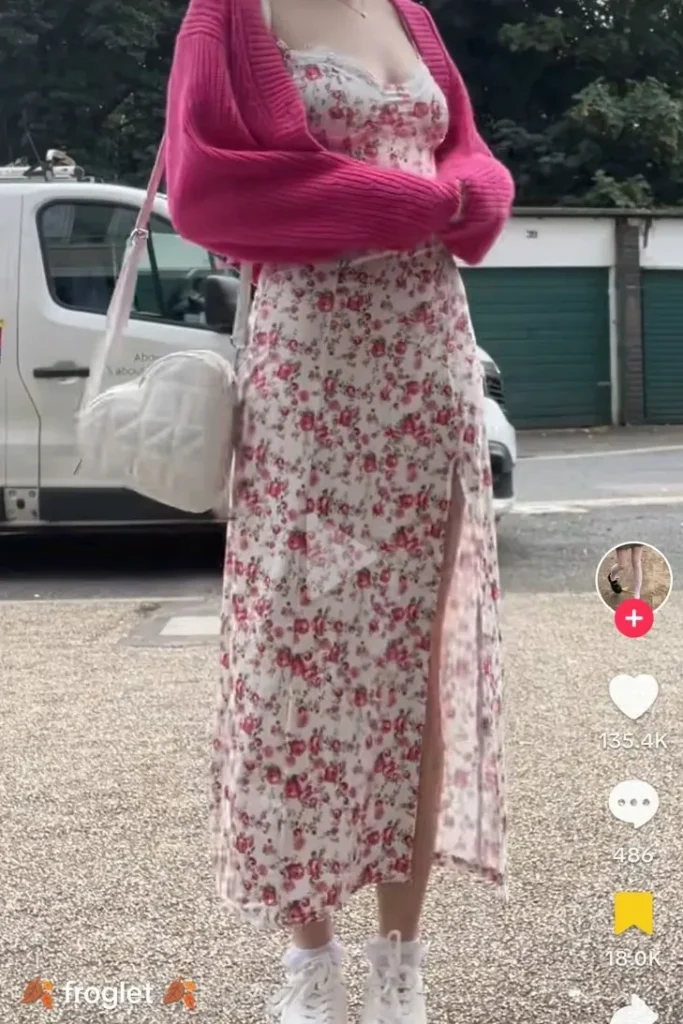 9. Cardigan + Floral Midi Dress + Clean Sneakers
