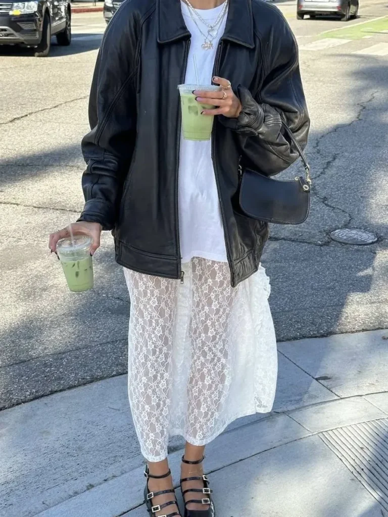 12. Oversized Leather Jacket + Lace Maxi Skirt + Mary Janes