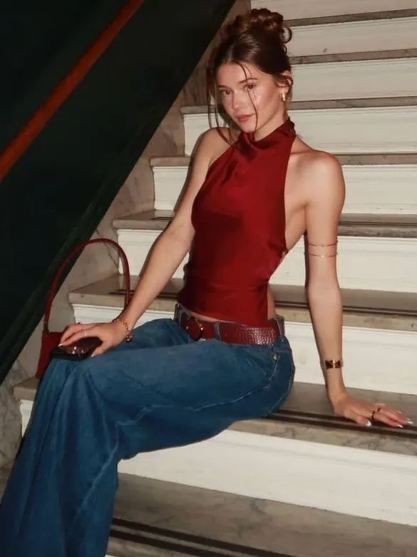 2. Halter Top + Wide Leg Jeans + Statement Belt