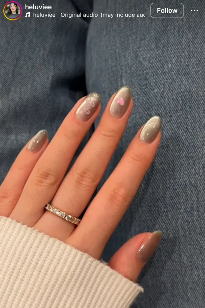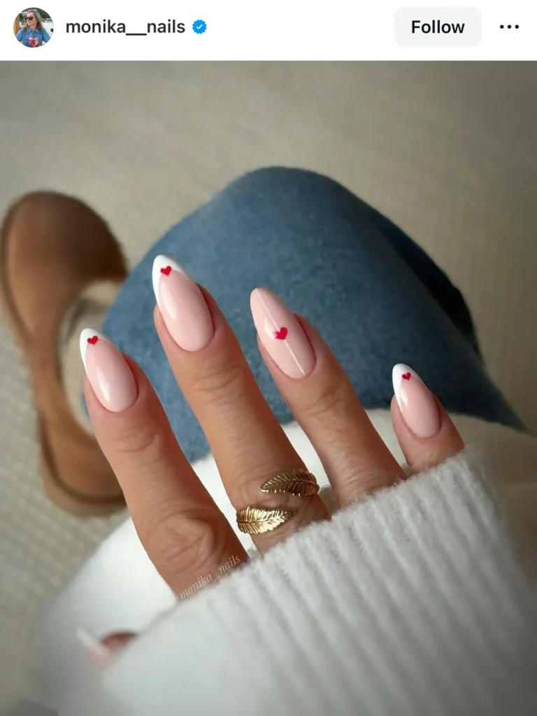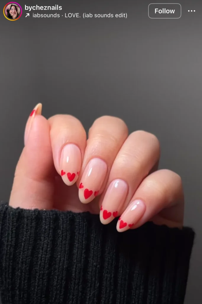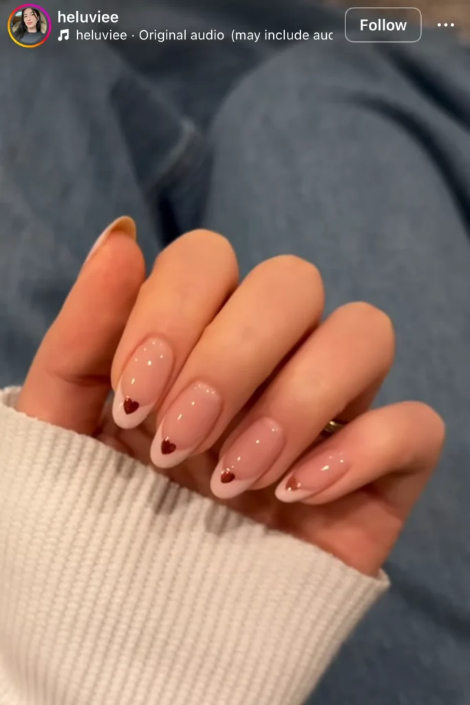 On almond nails, nude shades stretch out more gracefully, and the hearts along the French lines sit right in that curve.