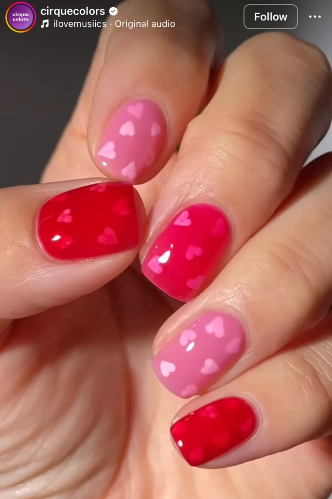 Each nail carries its own curve of pink and red, and the heart resting on the line keeps repeating in a way that feels playful rather than patterned.
