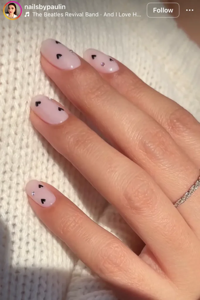 Milky white on short nails leaves everything looking clean, almost airy, and the tiny black hearts land on top with a simple clarity. The rhinestones catch the light for just a moment before disappearing again.