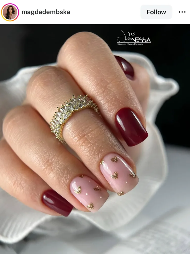 There’s something really calming about burgundy sitting next to that soft milky white. Those tiny gold hearts almost float on the lighter base, and they give the whole set this gentle little glow that feels very February.