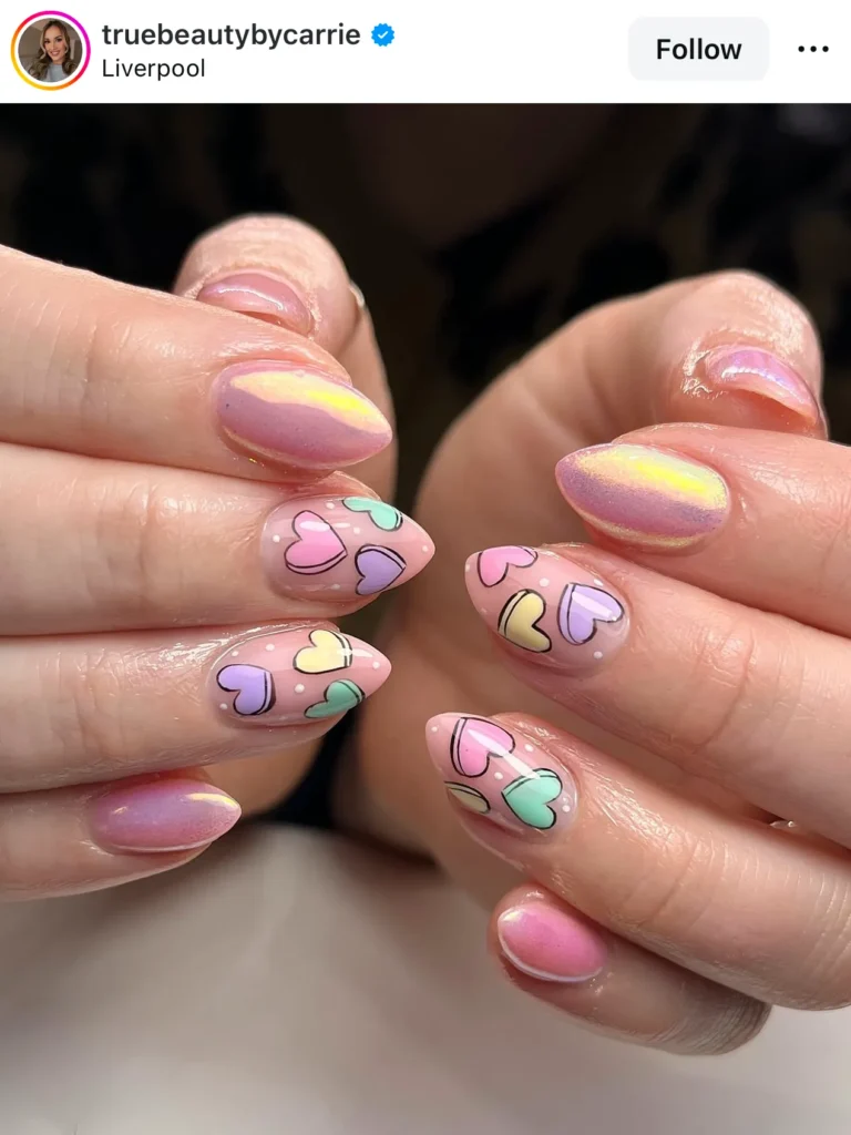Pearl pink keeps the almond shape looking smooth, and the pastel hearts rest over it like they’re part of the glow. It felt steady to me, almost intentionally calm.