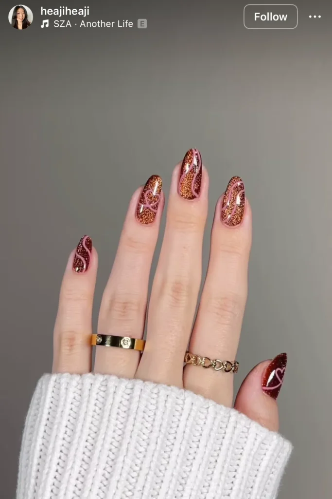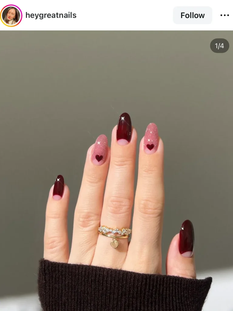 The ombre glitter gives off a faint glow, and the burgundy tip drops a deeper tone over it. Then the pink hearts slide in, and suddenly the set feels lighter again. You’ll probably catch the shift too—each layer showing up at a different moment.