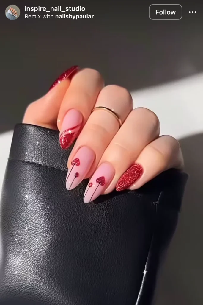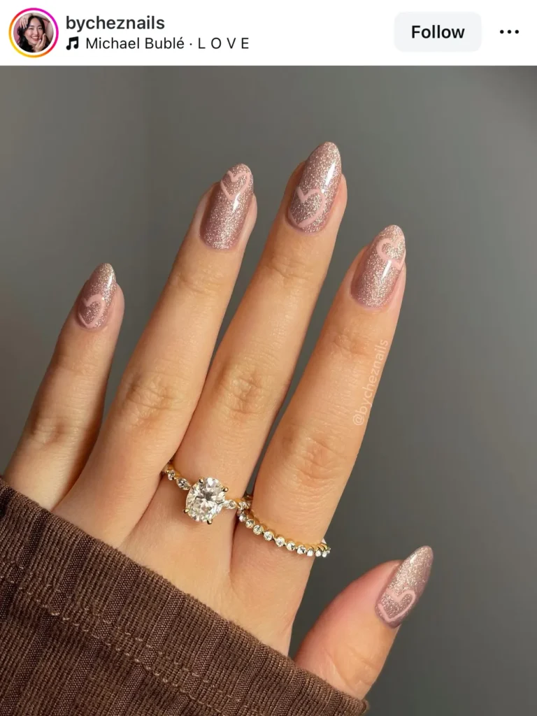 Glitter over a pink ombré tends to float more than it sits, and I like that about this style. It gives February nails a gentle sparkle that feels easy for you to wear but still bright enough to enjoy.