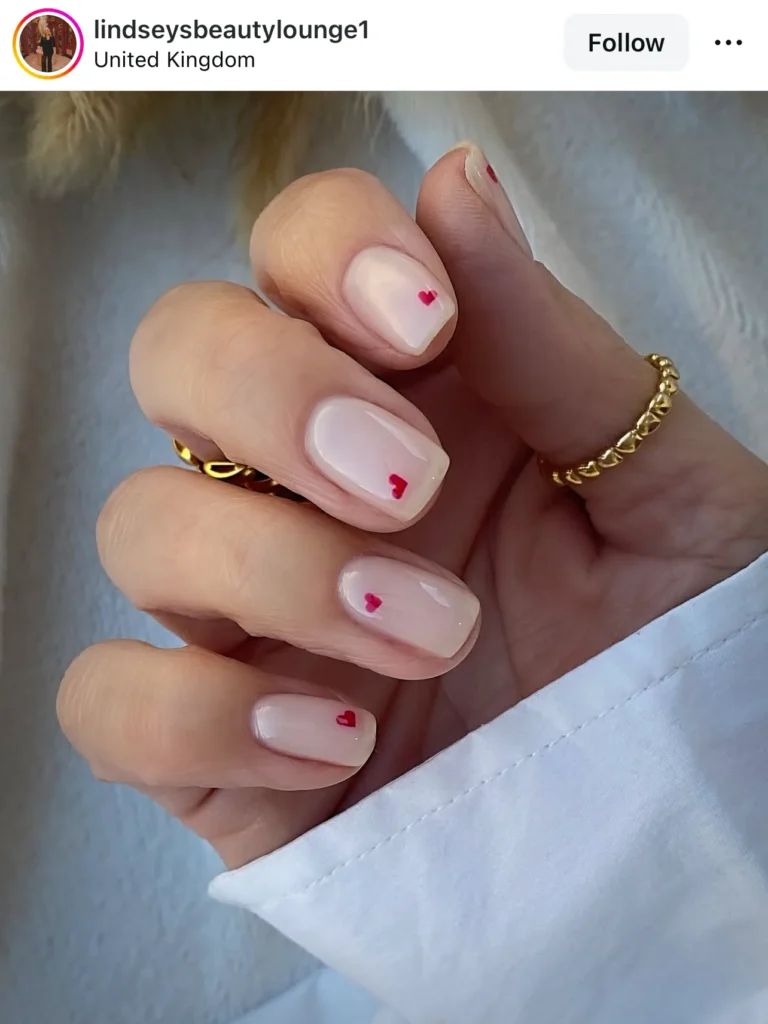 The nude shade barely says anything at first, which is why the hearts on the ring finger suddenly feel louder than they are. Maybe you’ll end up focusing there, just because everything else stays so calm.