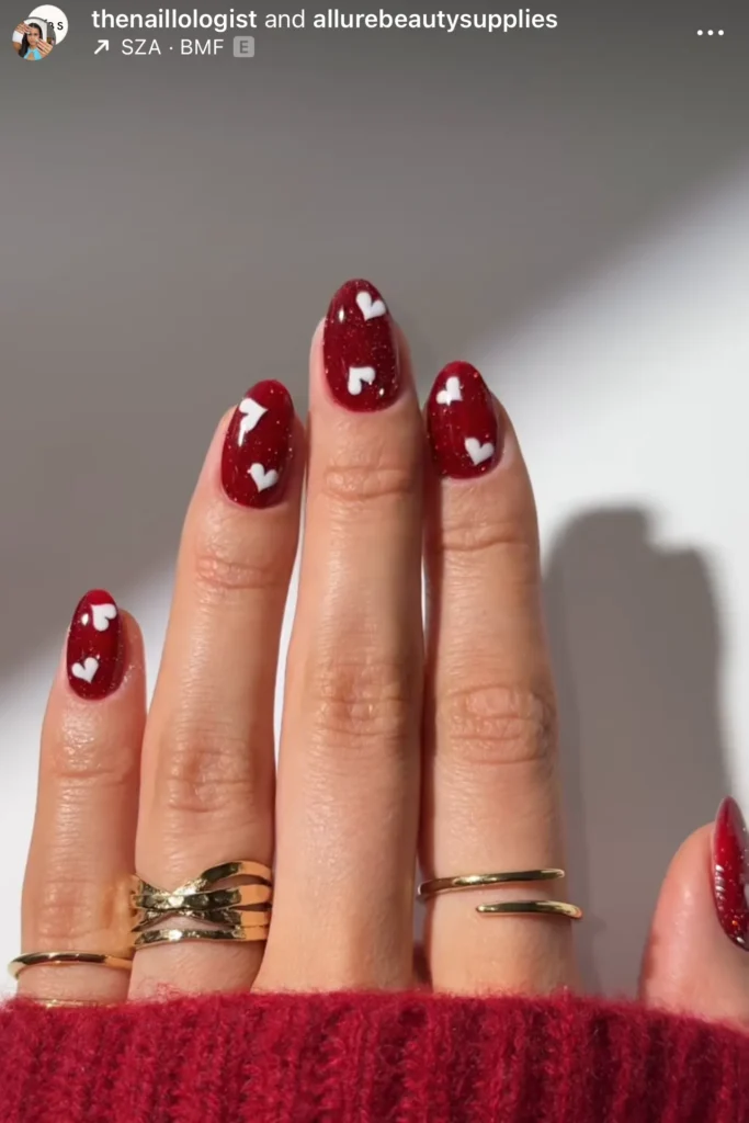 On shorter nails, the red glitter feels more concentrated, and the white hearts soften that intensity in a really easy way.