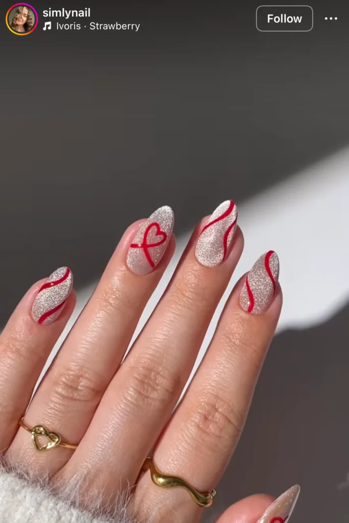 A silver cat-eye base already has its own direction, those thin lines of light sliding across the nail. And then the red swirl steps in and traces a heart without really announcing itself.