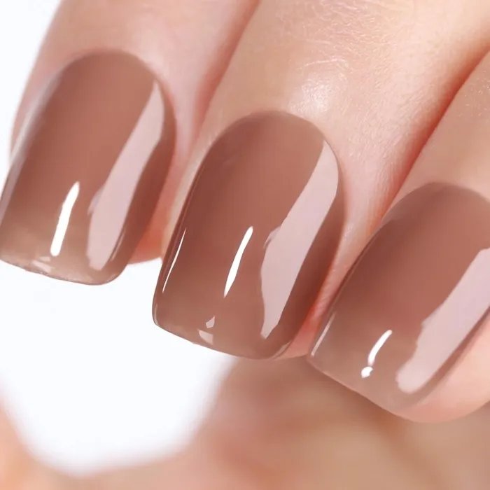 You know that coffee-syrup kind of color that looks soft, glossy, and expensive? That’s sheer nude brown. It’s that minimalist tone that works with everything — cozy sweaters, gold rings, or a clean winter manicure that still feels warm.